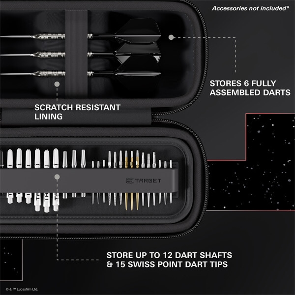 Den iøjnefaldende front med Darth Mauls røde og sorte markeringer fanger hans truende tilstedeværelse i et bold, battle-worn design. Og det er mere end bare et hyldest-look: BOA-walleten leverer funktion i topklasse med plads til op til 6 fuldt samlede dartpile, plus dedikerede rum til shafts, Swiss Points, flights og tilbehør.