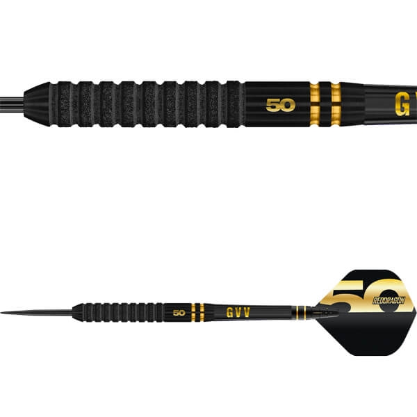 Gian van Veen har på kort tid fanget dartverdenens opmærksomhed med sit frygtløse talent og høje tempo. Denne eksklusive 50-års jubilæumsudgave fejrer hans opstigning mod toppen – med de præcise dartpile, som Gian selv spiller med, nu opgraderet med et sort Onyx-finish og gyldne detaljer, der symboliserer hans lovende fremtid.