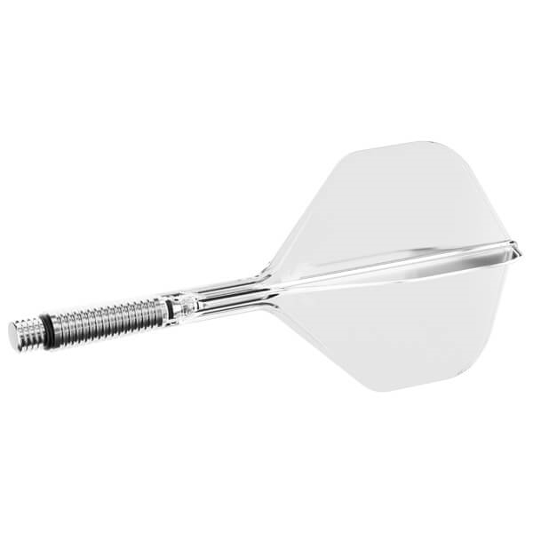Basen på skaftet er fremstillet i let aluminium med radiale riller for bedre greb ved montering og afmontering. En gummiring og 2BA-gevind sikrer en fast og stabil forbindelse til dartpilen, samtidig med at systemet kan bevæge sig kontrolleret ved behov.