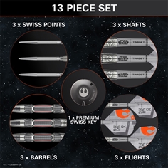 Hver detalje – fra de 95% tungsten dartpile med Swiss Point-system og K-Flex flights til de Millennium Falcon dartskiver og Stormtrooper wallets – er designet til at levere professionel ydeevne og galaktisk flair.
