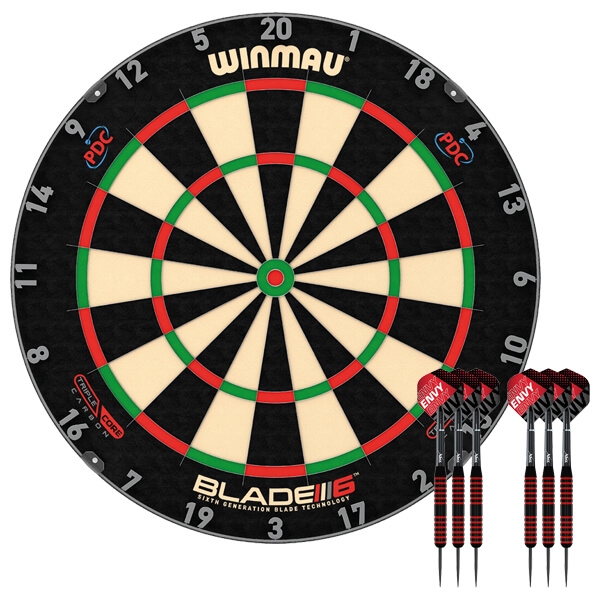 Ultimativ dartpakke med Winmau Blade 6 Triple Core Carbon, designet til seriøse spillere med krav om maksimal ydeevne.